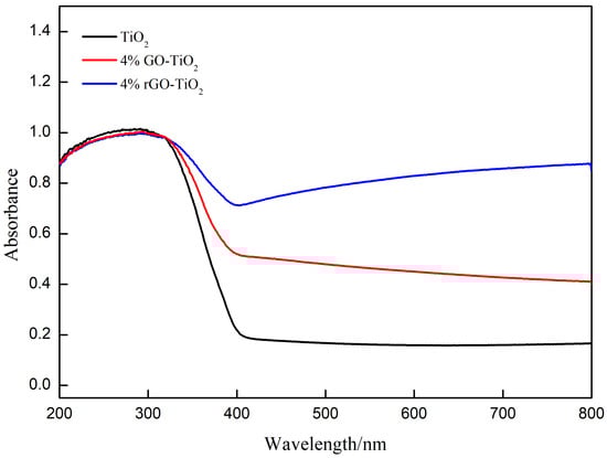 Figure 8 displays the diffusive reflectance and absorbance spectra of the nano-TiO2, 4% GO-TiO2, and 4% rGO-TiO2 samples. All samples exhibited strong absorption in the ultraviolet region (200−400 nm). For the 4% GO-TiO2 sample, red-shift absorbance can be observed. Furthermore, high-temperature vacuum annealing caused the more significant visible light absorption. The obvious shifts in the light absorption from UV to visible light clearly show the reduction of the band gap. Figure S7 reveals that the bandgaps of the nano-TiO2, 4% GO-TiO2, and 4% rGO-TiO2 samples were 3.19 eV (~388.73 nm), 2.95 eV (~420.58 nm), and 2.68 eV (~462.95 nm), respectively. That is, the incorporation of the GO or rGO coating and the high-temperature vacuum annealing can effectively narrow the bandgap, which critically influences the photocatalytic activity of catalysts [60,61,62].