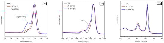 XPS spectra of the nano-TiO2, 4% GO-TiO2, and 4% rGO-TiO2. The left panel shows the O 1s spectra, highlighting the oxygen vacancy peak observed at approximately 532 eV for the 4% rGO-TiO2 sample. The mid panel depicts the C 1s spectra, where the formation of the C-O-Ti bond is observed around 286–287 eV. The right panel exhibits the Ti 2p spectra. The Ti 2p3/2 peak remains unchanged, while a decrease in the Ti 2p1/2 peak is observed in the 4% rGO-TiO2 sample compared to 4% GO-TiO2.
