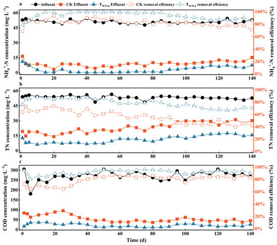 The findings indicated that the TWT14 system exhibited significantly higher pollutant removal efficiency compared with the CK system. Similarly, the research by Liu Huan et al. [12] shows that when the C/N ratio was 4 in the oxic granular sludge system introduced with HN–AD bacteria (the H-ABGS system), the total nitrogen removal efficiency of the H-ABGS was 12.05% higher than that of the traditional bacteria–algae symbiotic oxic granular sludge system (the ABGS system) and 44.86% higher than that of the oxic granular sludge (the AGS system). The enhanced pollutant removal capacity of the A/O biofilm system inoculated with WT14 could be attributed to changes in the microbial community, which improved the system’s ability in decomposing and transforming organic substances and nitrogen compounds in sewage. Furthermore, the enhanced removal efficiency of the TWT14 system indicated that it offered significant environmental and economic advantages by decreasing pollutant emissions in wastewater. It is imperative to highlight that the effluent quality produced by the TWT14 system adhered to the national discharge standards that have been established. This approach not only reduces the environmental impacts associated with wastewater discharge but also provides reliable technical support for the operational implementation of sewage treatment technologies. The results of this study offer a scientific foundation for the ongoing optimization and expanded application of the A/O biofilm system in sewage treatment processes. Furthermore, they provide suggestions for future research initiatives and practical applications.