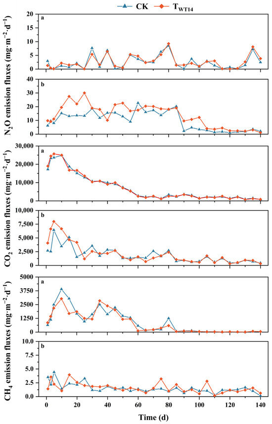 The GWP serves as a critical metric for measuring the impacts of GHGs; the value of GWP is directly associated with the potential contribution of these gases to global climate change. In this study, although there was no significant difference in the average total GWP values between the two systems, the TWT14 system performed better in terms of TN removal efficiency per unit mass, which may be related to the characteristics of the inoculation strain WT14. The implementation of WT14 had a substantial impact on the pollutant removal efficiency of the system (p > 0.01), which may be attributed to advancements in both the structural composition and functional capabilities of the microbial community [6]. The TWT14 system demonstrated considerable efficacy in nitrogen removal, accompanied by a reduced global warming potential to total nitrogen (GWP/TN) ratio. This indicated a lower environmental impact while effectively eliminating pollutants. The characteristic of the TWT14 system not only emphasized the efficiency of pollutant removal but also aligned with the principles of environmental sustainability. Consequently, this characteristic of the TWT14 system may enhance its potential influence on future environmental management strategies, particularly in the context of global warming and initiatives aimed at reducing GHG emissions.