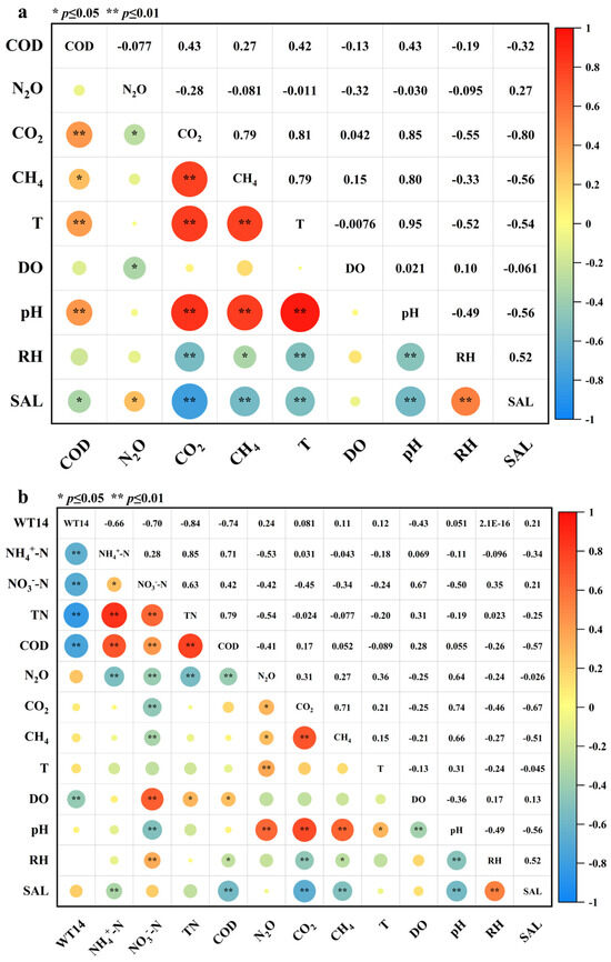Heat map of correlation between environmental factors and water quality change and gas emission in the anaerobic tank (a) and the oxic tank (b).
