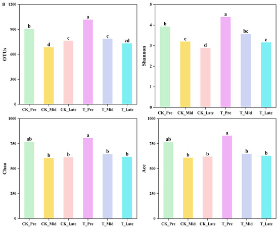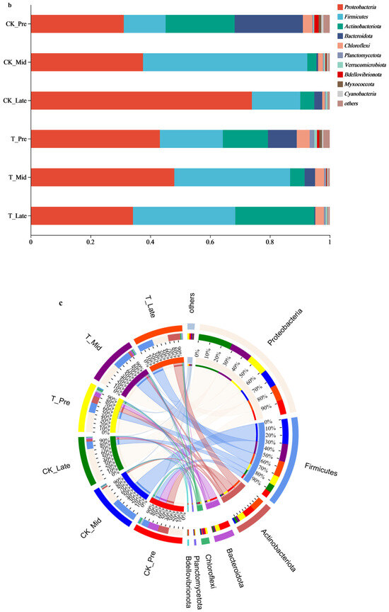 Alpha diversity serves as a quantitative metric for assessing the internal diversity found within a particular area or ecosystem. An increase in its value indicates a rise in both the abundance and the diversity of bacterial populations [33]. In the assessment of alpha diversity, a variety of indices are frequently utilized, including Chao, Shannon, Ace, Simpson, and Coverage, among others. It is essential to recognize that the Chao and Ace indices primarily measure the richness of a community, whereas the Shannon and Coverage indices are utilized to assess the diversity within that community. Figure 5a illustrates the richness and diversity of microbial communities present within the biofilms of the aeration tanks in both systems. In the initial phase of system operation (T_Pre), the OTUs reached a peak of 1018.0, while the Shannon diversity index was recorded at 4.4, and both the Chao and ACE indices were measured at 807.7 and 829.7, respectively, for the TWT14 system. The findings suggested that the introduction of the WT14 strain significantly increased both the diversity and the richness of the microbial community within the A/O biofilm system. During the intermediate phase of system operation (CK_Mid, T_Mid), a notable decline in the indices of both systems was observed, indicating a decrease in the richness and diversity of microorganisms as the operation progressed. In the advanced phase of the CK system’s operation, a notable decline in the Shannon index was observed, whereas the Chao and ACE indices exhibited stability. This suggested that during the later stage of the CK system (CK_Late), a specific microorganism may have established a dominant presence on the carrier, with its ecological role becoming particularly pronounced in the effective treatment of rural domestic sewage. In the later operational phase (T_Late) of the TWT14 system, the Chao and ACE indices were found to be comparable to those observed in the CK system. The Shannon index exhibited a significant increase in the TWT14 system. This observation suggested that the improved nitrogen removal efficiency exhibited by the TWT14 system during this phase was likely correlated with an increase in microbial diversity within its biofilm.
