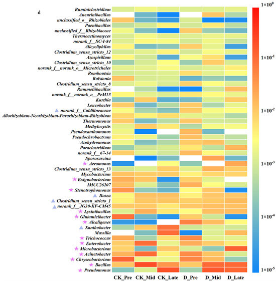 Composition of microbiological phyla and genera at different stages of operation. (a) New information on the abundance and diversity of microflora in biofilm samples (lower case letters indicate statistically significant differences, p < 0.05). (b,c) The composition and distribution of bacterial colonies at the phylum taxonomic level (TOP10), respectively. (d) A heat map of the distribution of bacterial colonies at the genus level. Pentagrams label HN–AD bacteria, and triangles label denitrifying bacteria.