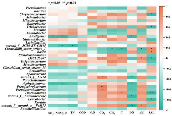 Heat map of correlation of bacterial genera with pollutant concentrations, GHG emissions, and environmental factors. ** indicates significant correlation at the 0.01 level (two-sided); * indicates significant correlation at the 0.05 level (two-sided).