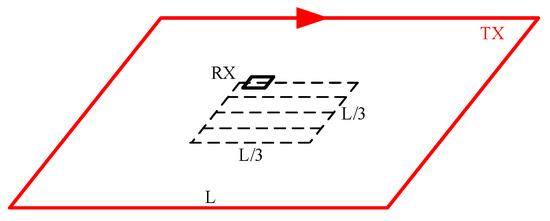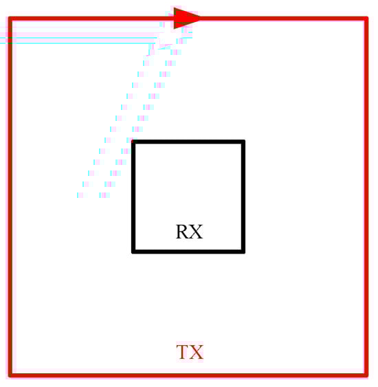 The central loop method is one of the most commonly used coil device forms in TEM sounding. The transmitting loop and receiving loop are coplanar, with the receiving loop positioned at the center of the transmitting loop. The advantages of the central loop device lie in its simple structure, portability, and ability to achieve optimal coupling with the target body. It is especially suitable for high-resolution detection of shallow geological structures, and can achieve a certain exploration depth [26,27,28]. By adjusting the size of the transmitting coil, the central loop device can adapt to exploration needs under different terrain conditions, demonstrating excellent adaptability [29]. However, this type of loop device also has some limitations. For example, its detection depth is mainly restricted by the length of the transmitting loop’s sides, requiring precise control to achieve optimal detection results [30]. In specific environments, such as the seabed, the central loop device has poor resolution capabilities for a high-resistivity seabed [31]. Central loop devices are shown in Figure 4.