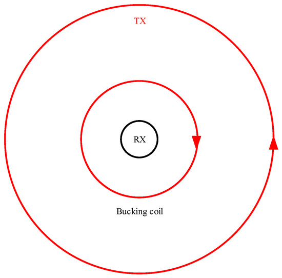 The introduction of bucking coils is designed to mitigate the mutual inductance between the transmitting and receiving coils. This is achieved by generating a magnetic field opposite to that of the transmitting coil, thereby eliminating or reducing the influence of the primary magnetic field on the receiving coil. Consequently, this reduces the contamination of early secondary magnetic field signals by primary magnetic field signals [69]. Thanks to this compensatory design, bucking coils exhibit a larger transmission magnetic moment, higher coupling strength between the receiving coil and underground objects, superior signal-to-noise ratios, and enhanced system flexibility. However, in ground-based small-loop TEM systems, the size of the receiving coil in the bucking coil is constrained, leading to insufficient bandwidth. Additionally, it may introduce near-field effects, creating blind zones for shallow detection [70]. In large-scale systems, bucking coils are typically large and heavy. Bucking coil devices are depicted in Figure 10 and Figure 11.