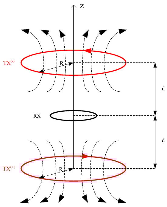 The coil configuration of the opposing-coils TEM (OCTEM) was first publicly introduced by Zhenzhu Xi’s team in 2016. This technology was developed to eliminate the induced electromotive force inherent to the receiving coil itself. The fundamental principle involves using two parallel, coaxial coils with identical numbers of turns [75]. By passing reverse currents through these coils, their magnetic fields cancel each other out, serving as the emission source and generating a pure secondary field response signal. Compared to traditional coil devices, the equivalent opposing magnetic flux coil system offers significant advantages. OCTEM technology effectively reduces blind zones in shallow detection by monitoring the pure secondary field response underground. The dual-coil source design concentrates the energy of the ground-centered coupled field and minimizes side effects, thereby enhancing the lateral resolution of shallow anomalies. The miniature coil design employed by OCTEM facilitates the integration of transmitting and receiving antennas, which not only benefits field operations in confined work areas, but also ensures consistency across observation points, thereby improving data reliability. However, such devices require precise coil deployment in practical applications, as even minor variations can prevent the complete elimination of the primary field. The equivalent opposing magnetic flux device is illustrated in Figure 12.