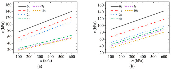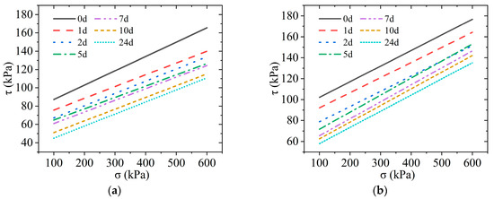 Following the same procedures as the wet–dry cycling experiments, the Mohr–Coulomb failure envelopes for the soaking time experiments were plotted, as depicted in Figure 4.