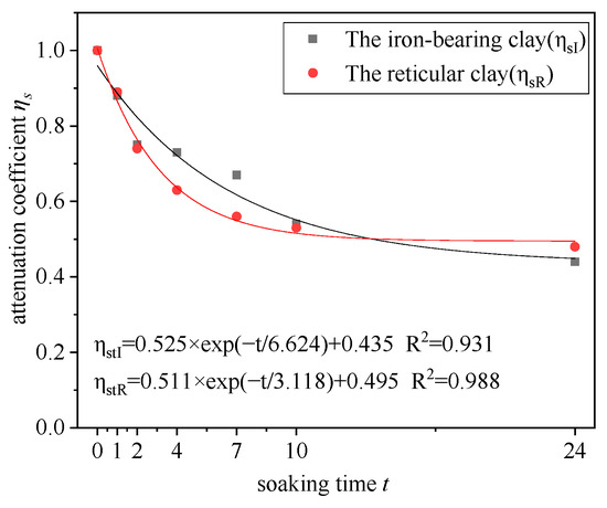 Following the same curve-fitting process as wet–dry cycles, the fitting curve of the decay coefficient [ηs] of Paleo-clay with soaking time [t] was plotted, as shown in Figure 5.