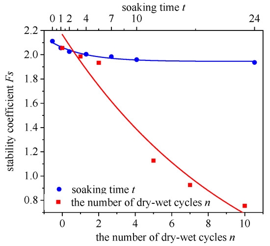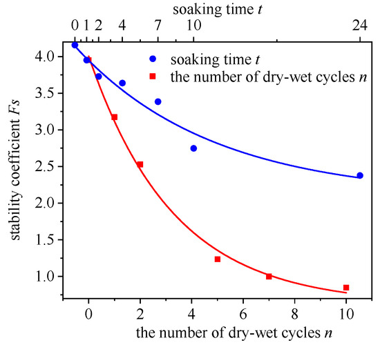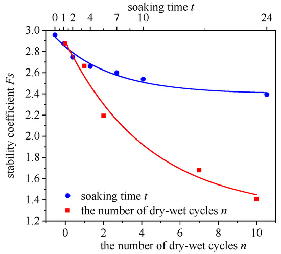 Both soaking and wet–dry cycles lead to a significant reduction in the strength of Paleo-clay, causing a rapid decline in slope stability. The stability coefficients of the slopes all exhibited exponential decay. This was similar to the findings of Khan et al. [13] and Nobahar et al. [21], verifying the results’ correctness.