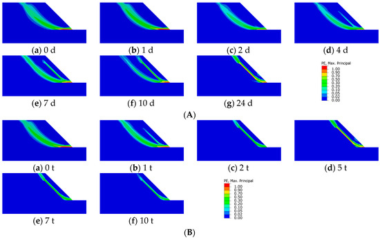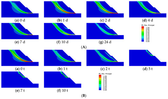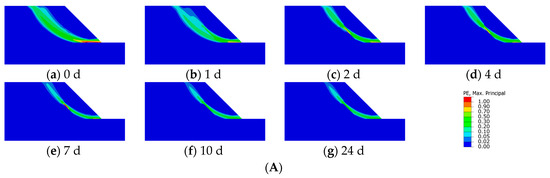 As can be seen in Figure 14, the breeding site of the Type III slope sliding zone under both conditions has the same tendency to transform from a deep sliding zone to a shallow one. When the soaking reaches 5 days and the wet–dry cycle reaches one time, the shallow plastic zone begins to appear, but it does not penetrate. When soaking reaches 24 days and wet–dry cycles reach two times, the sliding zone breeding site is completely converted to a shallow layer. Type III slopes also exhibit the characteristics of traction landslides. The initiation points of the sliding zone all originate at the slope toe. The deep sliding zone progressively develops in a circular arc towards the slope crest while the shallow sliding zone gradually extends in a linear pattern towards the slope crest.