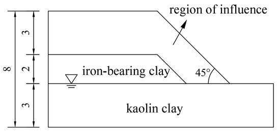 For the Type I Paleo-clay slope comprising iron-bearing clay and fissured clay layers, a numerical model was constructed using a representative cross-section, as depicted in Figure 6. It is essential to note that the failure of Paleo-clay slopes is a repetitive process, often occurring at shallow depths. Research indicates that the shallow layers of slopes are influenced by climatic conditions including rainfall seasons and wet–dry cycles [39]. Using the assumptions consistent with Qi et al. [26] and Zhang et al. [27], the shallow strength deterioration zone was parallel to the slope surface and of equal thickness, and the shallow 3 m range of the Paleo-clay slope was taken as the strength deterioration zone.