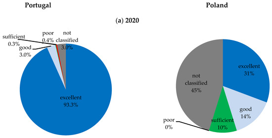 The first part concerns the quality of bathing waters in both countries as reported by the European Environment Agency [13,14,15,16,17,18], the Portuguese Environment Agency (APA), the Directorate-General of Health (DGS) [19,20,21,22,23,24,25,26], and the Polish Bathing Water Quality Service [27,28,29]. Bathing water quality, defined in the European Union (EU) Bathing Water Directive (BWD) [9], is determined as excellent, good, or sufficient (Table 1). Reported bathing waters also include those that could not be classified due to not having a set of 16 samples despite having been monitored. Some of the monitored bathing waters were in line with the minimum quality standards of the BWD, and were thus classified as “sufficient”. Waters below the minimum quality were “poor”. Some waters with better than “sufficient” quality were classified as “good” or “excellent”.