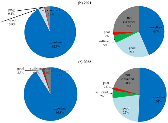 In the 2022 bathing season, 90.8% (of 509 sites) were rated excellent, 3.7% received a good rating, 0.4% were classified as acceptable, and 1.0% as poor. The relevant proportion of the bathing waters monitored was 4.1% (Figure 2c).