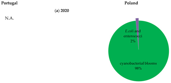 The first part of the study presents the status of coastal bathing waters in Portugal and Poland over a 3-year period, i.e., 2020–2022. The results obtained from both countries are shown in Figure 2. In this section, information about restrictions due to microbiological organisms (e.g., E. coli, intestinal enterococci, and cyanobacteria) and other factors (e.g., natural events) are also presented (Figure 3, Tables S1 and S2).