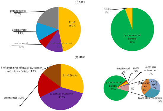 A high number of bathing prohibitions were communicated in the 2021 and 2022 bathing seasons (mainly in 2022) by the Portuguese authorities, informing and alerting the public about bathing water quality with a view to preventing bathers’ exposure to unsafe waters (Figure 3 and Table S1) [19,20,21,22,23,24,25,26]. In the two bathing seasons, bathing prohibitions were mainly due to high values of bacterial enumerations (E. coli and intestinal enterococci), which were responsible for 67% of prohibitions in 2021 (Figure 3b 2021) and 85% in 2022 (Figure 3c 2022). Furthermore, in 2021, the risk of pollution and the presence of coelenterates were responsible for 33% of bans, and in 2022, five coastal bathing waters remained prohibited for 10 days due to the firefighting runoff from a factory (Figure 3c 2022).