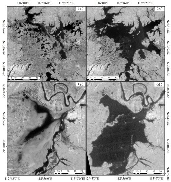 - Wang, Z.; Xie, F.; Ling, F.; Du, Y. Monitoring surface water inundation of Poyang Lake and Dongting Lake in China using Sentinel-1 SAR images. Remote Sens. 2022, 14, 3473. [Google Scholar] [CrossRef]