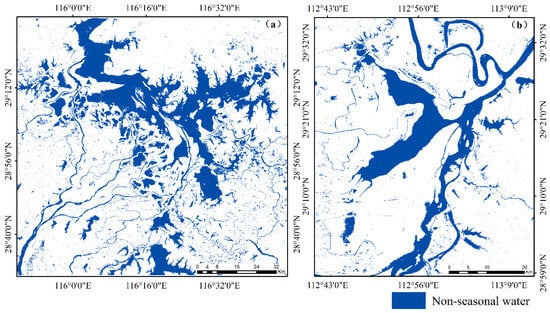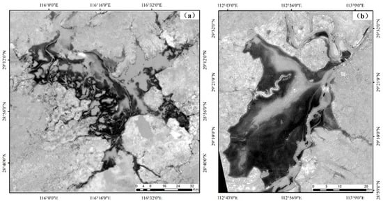 - Li, J.; Wang, C.; Xu, L.; Wu, F.; Zhang, H.; Zhang, B. Multitemporal water extraction of dongting lake and poyang lake based on an automatic water extraction and dynamic monitoring framework. Remote Sens. 2021, 13, 865. [Google Scholar] [CrossRef]