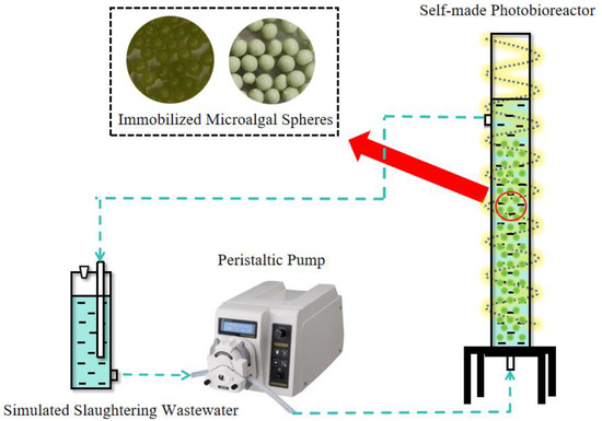 In order to meet the light intensity requirement of microalgae during the experiment, the experiment reactor was made of plexiglass with good light transmission and mechanical properties. The experimental facility, as shown in Figure 3, was a circulating system composed of a Martens flask, peristaltic pump, self-made photobioreactor, light sources and many silicone hose tubes. The reactor part of the experimental facility was a cylinder with a diameter of 2.5 cm and a height of 40 cm, of which the effective volume was about 200 mL. There was a grid plate at the bottom of the cylinder, which was connected with silicone hose tubes. In the experiment, light emitting diodes were used as light sources to fix around the reactor. An amount of 25 g of the above different immobilized microalgal spheres were added into the reactor, and the SSW treatment conditions were optimized by adjusting the water flow rate, light intensity and changing the type of immobilized microalgal spheres.