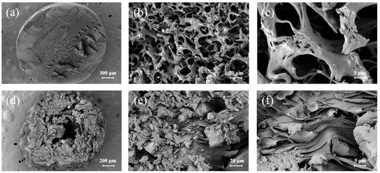 SEM of two kinds of gel balls. (a) PS-GB, 31×; (b) PS-GB, 500×; (c) PS-GB, 2.00 k×; (d) SS-GB, 40×; (e) SS-GB, 500×; (f) SS-GB, 2.00 k×.