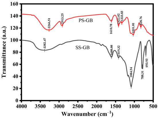 The results of the FTIR of PS-GB and SS-GB are shown in Figure 5. PS-GB had seven distinct absorption peaks at the wave number of 4000–500 cm−1 [19,20]: (1) The absorption peak at the wave number of 3266.51 cm−1 was attributed to the stretching vibration of O-H in alcohols and N-H in ammonium salts; (2) the absorption peak near the wave number of 2913.25 cm−1 was the stretching vibration of C-H; (3) the absorption peak near the wave number of 1610.78 cm−1 was the asymmetric stretching vibration of -COO- in carboxylate salts; (4) the absorption peak at the wave number of 1422.02 cm−1 was the symmetric stretching vibration of -COO- in carboxylate salts; (5) the absorption peak at the wave number of 1333.03 cm−1 was weak and was the stretching vibration of P-C; (6) the absorption peak of the stretching vibration of C-O-C was at the wave number of 1031.01 cm−1; (7) the absorption peak of the skeleton vibration of -CH(CH3)2 was at the wave number of 828.76 cm−1. SS-GB had six distinct absorption peaks at the wave number of 4000–500 cm−1 [19,20]: (1) the absorption peak at the wave number of 3382.47 cm−1 is attributed to the stretching vibration of O-H in the hydroxyl and N-H in the amidogen, which is the characteristic peak of sodium alginate; (2) the absorption peak at the wave number of 1608.08 cm−1 was caused by the asymmetric vibration of -COO- in sodium alginate; (3) the symmetric vibration of -COO- in sodium alginate was at the wave number of 1419.32 cm−1; (4) the absorption peak of the stretching vibration of C-O-C was at the wave number of 1084.94 cm−1; (5) the absorption peak of the asymmetric stretching vibration of Si-O-Si was at the wave number of 788.31 cm−1; (6) the absorption peak at the wave number of 693.93 cm−1 was the stretching vibration of Si-C.