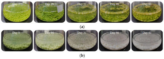 The resistance to the biodegradation of SS-MS and PS-MS is shown in Figure 8. As shown in Figure 8, some SS-MS were seriously damaged and floated on the liquid surface at the 16th day of cultivation. The microalgal cells started to leak from SS-MS after 31 days of cultivation. PS-MS were not damaged and there were few microalgal cells leaking from them. The results indicate that the resistance to the biodegradation of PS-MS was better than that of SS-MS. According to the result of the FTIR, this is because a large number of hydroxyl groups formed hydrogen bonds in PVA, which resulted in molecular chains with a higher mechanical strength. The molecular chain of SA was soft and had poor mechanical strength. Relevant research has shown that the presence of PO43− in solution could destroy the surface structure of SA gel balls to a certain extent [26]. The rapid growth of microalgal cells in SS-MS also destroyed the internal structure of SA, which resulted in poor resistance to the biodegradation.