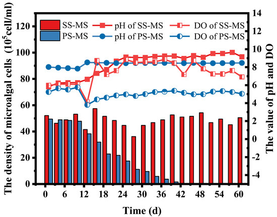 The activity of microalgal cells in SS-MS and PS-MS are shown in Figure 8 and Figure 9. As can be seen in Figure 8, the microalgal cells in SS-MS remained active in 61 days of cultivation, while the activity of the microalgal cells in PS-MS decreased in 61 days of cultivation. The growth of microalgal cells in the two kinds of immobilized microalgal spheres, under the same conditions of cultivation, is shown in Figure 9. As shown in Figure 9, the density of microalgal cells in SS-MS was found to be stable, though always fluctuated around 5 × 106 cell/mL. The density of microalgal cells in PS-MS was stable in 10 days of cultivation, at 5 × 106 cell/mL. After 40 days of cultivation, the density of microalgal cells in PS-MS reduced to 0 cell/mL. Figure 9 also shows the changes in pH and DO. The pH of the culture solutions of two kinds of immobilized microalgal spheres changed from neutral to slightly alkaline. At the same time, the DO of the culture solution of SS-MS was not stable and was higher than that of PS-MS.
