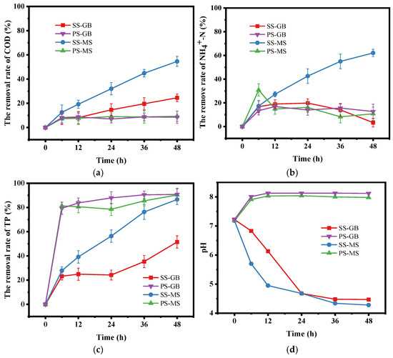 For PS-GB, the removal rates of TP, COD, and NH4+-N in SSW reached 90.76%, 8.48% and 12.70%, respectively, in 48 h of treatment. It can be seen that PS-GB has a good effect on the removal of TP and a poor effect on the removal of COD and NH4+-N. As shown in Figure 10d, the pH of SSW maintained neutrality and alkalinity in the process of SSW treatment by PS-GB. Relevant research has shown that the alkaline environment is conducive to the precipitation of PO43− in wastewater [29]. Therefore, PS-GB had good effects on the removal of TP.