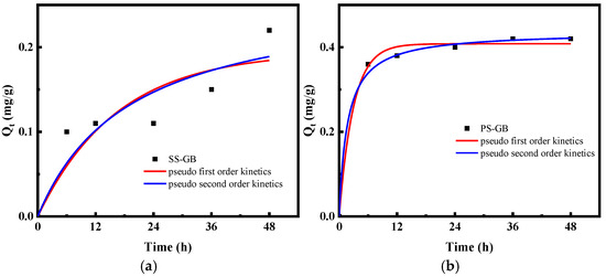 Pseudo-first-order and pseudo-second-order dynamics models were used to fit the experimental data and analyze the law of dynamics. The kinetic fitting curves of the adsorption of TP by SS-GB and PS-GB are shown in Figure 11. As shown in the relevant kinetic parameters in Table 2, the adsorption capacity of SS-GB for TP in SSW predicted by the pseudo-first-order and pseudo-second-order kinetics was 0.19 mg/g and 0.20 mg/g, respectively. The results were found to be relatively close to the 0.22 mg/g measured in this experiment. The R2 of pseudo-second-order kinetics, which was 0.9980, was larger than that of pseudo-first-order kinetics, which was 0.7531. This indicates that the adsorption of TP in SSW by SS-GB was more consistent with the pseudo-second-order kinetic equation and was controlled by physical adsorption [32]. The adsorption capacity of PS-GB for TP in SSW predicted by the pseudo-first-order and pseudo-second-order kinetics was 0.41 mg/g and 0.43 mg/g, respectively. The results are close to the 0.42 mg/g measured in this experiment. The R2 of pseudo-first-order kinetics, which was 0.9923, was larger than that of the pseudo-second-order kinetics, which was 0.9569. This indicates that the adsorption of TP in SSW by PS-GB was more consistent with the pseudo-first-order kinetic equation and was controlled by chemisorption [32]. The k1 of PS-GB in the pseudo-first-order kinetic equation was larger than that of SS-GB in the pseudo-first-order kinetic equation. The k2 of PS-GB in the pseudo-second-order kinetic equation was larger than that of SS-GB in the pseudo-second-order kinetic equation. This indicates that the TP adsorption rate of PS-GB was higher than that of SS-GB and that the adsorption equilibrium time of PS-GB was shorter than that of SS-GB [32,33].