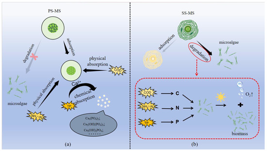 Treatment mechanism of SSW by two kinds of immobilized microalgal spheres. (a) SS-MS and (b) PS-MS.