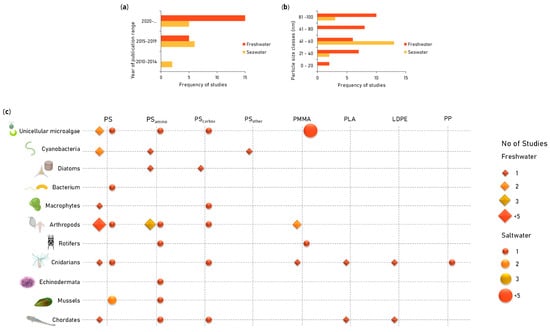 A total of 21 articles addressing freshwater organisms and 13 articles addressing marine or estuarine organisms met all the criteria established and were fully read. The information collected: year of publication, type, shape, size, and origin of NPL used; characterization of NPL performed (including techniques used, matrices, and, when available, concentration tested, and moments of analysis), biological assays (phylum and order of species studied, age or developmental stage of the organisms studied, replicates, number of organisms per replicate, and assay duration; the endpoints analyzed), and the LC50 and EC50 (, respectively), are summarized in Supplementary Table S1 for freshwater and in Supplementary Table S2 for marine and estuarine waters.