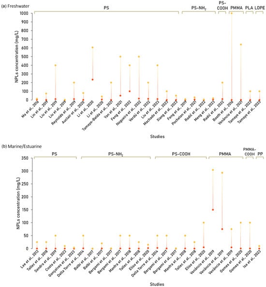 Range of nanoplastics concentrations (expressed as mg/L) used in the studies obtained in the literature search performed in the Web of Science database under the pairing of keywords “nanoplastic” and “effective concentration” or “LC50” or “EC50” for the freshwater (a) and marine/estuarine (b) compartments. LDPE, low-density polyethylene; PLA, polylactic acid; PMMA, polymethylmethacrylate; PP, polypropylene; PS, polystyrene; PS-COOH, carboxyl-functionalized polystyrene; PS-NH2, amino-functionalized polystyrene. Note: This range is represented by the lowest and highest tested concentrations. More detailed information is provided in the Supplementary Data file [15,32,34,36,37,38,39,40,42,43].