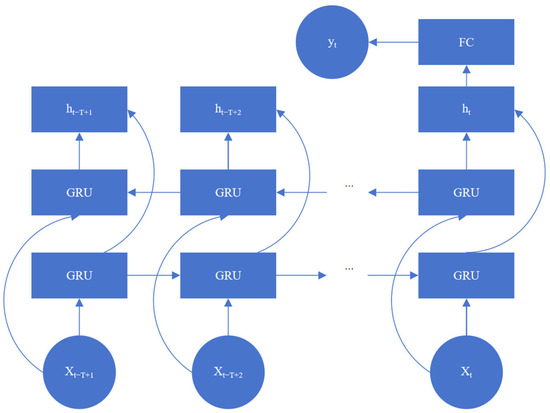 BiGRU consists of two independent GRU layers: one processes the input sequence in the forward direction, while the other processes it in the reverse direction [23]. Each GRU unit updates its state and generates output based on the current input and the previous hidden state. By leveraging both forward and backward processing, BiGRU captures long-range dependencies within sequences, enhancing the model’s performance. Its network structure is shown in Figure 3.