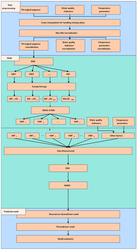 This research introduces the ERSCB hybrid model framework for TN concentration prediction, which consists of three components, starting with data preprocessing. In this phase, the original TN concentration data, key water quality indicators (TP, DO, NH3, Conductivity), and temperature parameters are processed for missing value imputation and standardization to ensure data quality. The second component involves model design, in which a multi-step optimization strategy is applied. Initially, EMD is used to decompose the TN series into multiple IMFs and RES. The SE values of these components are then calculated to evaluate their complexity. Subsequently, RBOA is introduced to optimize the balance parameter α of SVMD. The subsequence with the highest SE value undergoes a second decomposition, generating a series of VMFs to enhance the precision of feature extraction. The third part is the prediction of results. The TN values of the subsequences are reconstructed, and the CNN-BiGRU prediction model is used to obtain the final short-term TN forecast. The model’s performance and reliability are thoroughly evaluated using a series of metrics. The flowchart of ERSCB is shown in Figure 4.