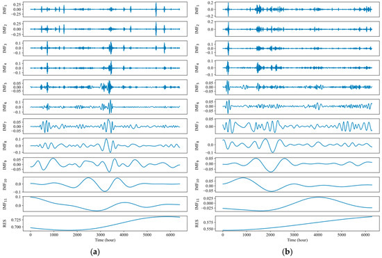 EMD decomposition results of KaShi River and GongNaiSi River data. (a) KaShi; (b) GongNaiSi.