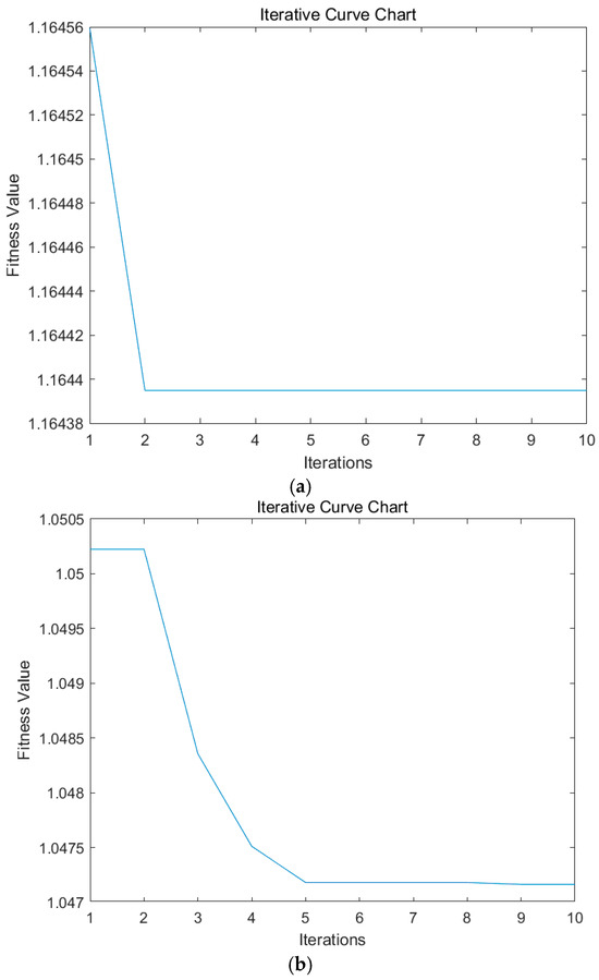 Using the RBMO-optimized SVMD algorithm, the IMF1 and IMF4 components from the two observation stations, obtained through EMD decomposition, were further decomposed. RBMO was used to optimize the balancing parameter of the SVMD. The fitness function used was Envelope Entropy (EE). Both the population size and the number of iterations in the RBMO algorithm were set to 10. The iterative curve is shown in Figure 6, where the horizontal axis denotes the number of iterations and the vertical axis indicates the fitness function value. The graph shows that the fitness values stabilized after 2 and 9 iterations, respectively. The best balancing parameter values are listed in Table 4, with the optimal balancing parameters for the two monitoring stations being 1000 and 1385, respectively. Since only one parameter is optimized, the iteration curve is almost identical to the parameter variation graph.
