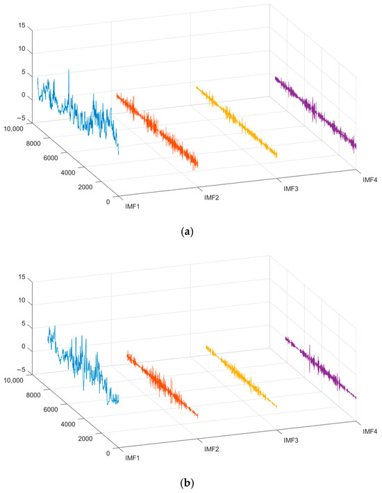 Three-dimensional decomposition diagram after secondary decomposition. (a) The second decomposition results for KaShi River data. (b) The second decomposition result for GongNaiSi River data.