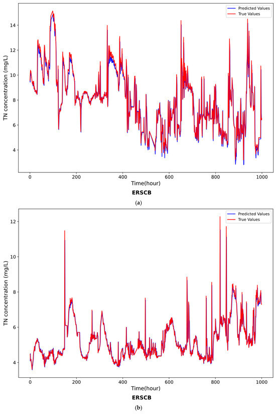 The proposed ERSCB model’s line charts for TN concentration predictions at the KaShi and GongNaiSi River monitoring stations. (a) KaShi; (b) GongNaiSi.