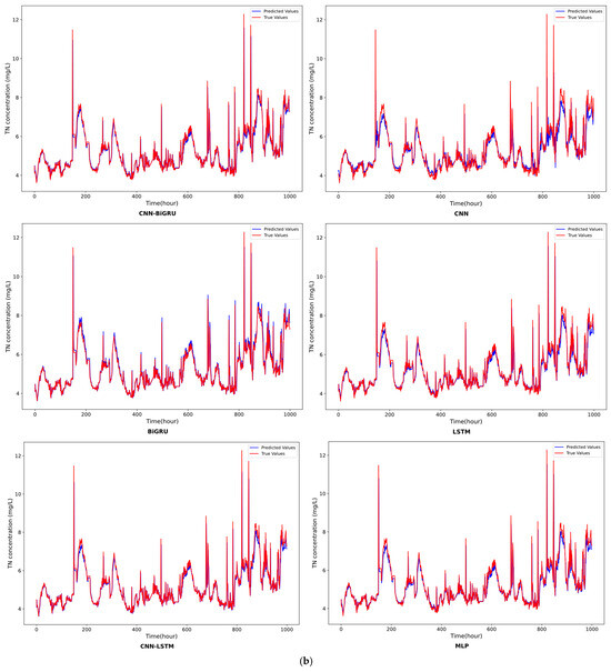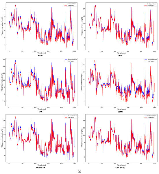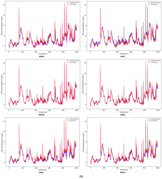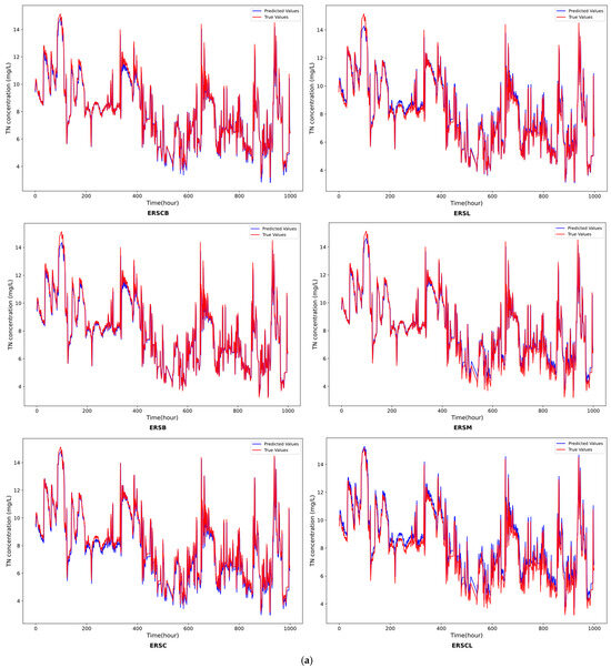 The decomposed components were combined with the water quality factors and temperature parameters, and CNN and BiGRU were used to predict TN concentration data, forming the model’s final predicted values. This approach yielded TN concentration predictions for the KaShi River and GongNaiSi River monitoring stations. Figure 8 shows the predictive performance of ERSCB at the two monitoring stations, indicating that the proposed ERSCB model demonstrates a high degree of fitting accuracy.