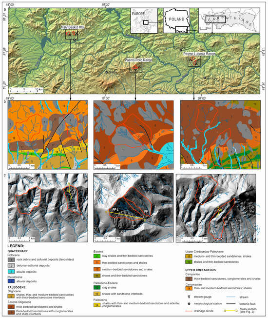 Study area. The location of three research areas (the Mały Beskid Mts., the Pasmo Polic Range, and the Pasmo Lubonia Range) in the Carpathian Mountains (a). Geological (b) and LiDAR (c) maps of the studied landslide catchments (MB-L, PP-L, and PL-L) and non-landslide catchments (MB, PP, and PL).