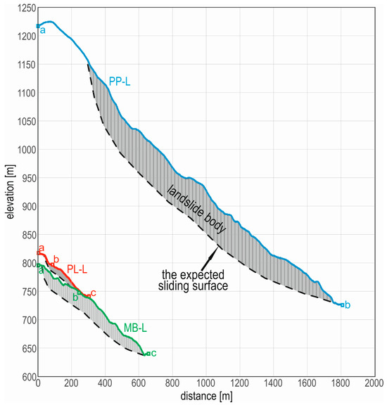 Cross-sections and estimated depths of landslides in the Mały Beskid Mountains (MB-L catchment), the Pasmo Polic Range (PP-L catchment), and the Pasmo Lubonia Range (PL-L catchment). The locations of the cross-sections are shown in Figure 1.