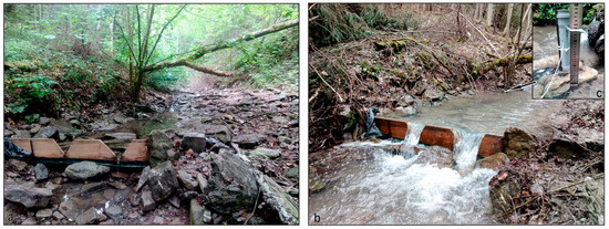 The weirs with two V-notches installed at the outlet of the studied streams allowed for precise volumetric discharge measurements during low-flow periods (a) and medium-flow periods, up to about 30 L/s/km2 (b). (c) The staff gauge and the tube with an automatic stream water level device (example from the PP-L catchment in the photo by J.P. Siwek).