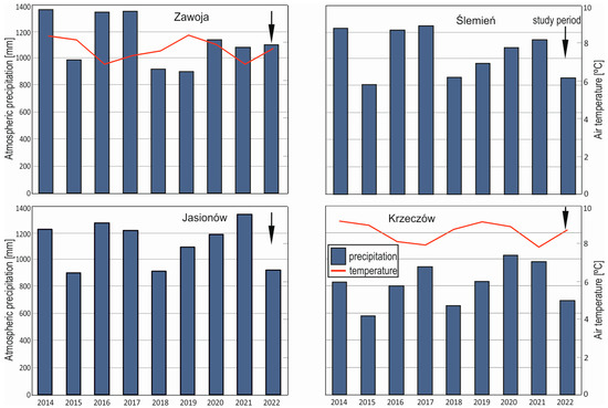 Annual atmospheric precipitation totals and average air temperature at Zawoja, Ślemień, Jasionów, and Krzeczów meteorologic stations in 2014–2022 (lack of air temperature data at Ślemień and Jasionów).