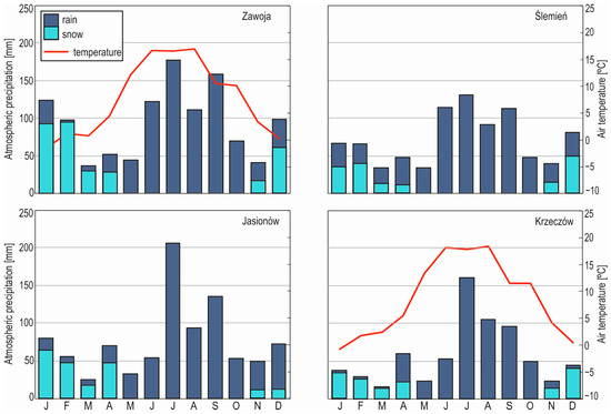 Monthly atmospheric precipitation totals in the form of rain and snow, and average air temperature at Zawoja, Ślemień, Jasionów, and Krzeczów meteorologic stations in 2022 (lack of air temperature data at Ślemień and Jasionów).