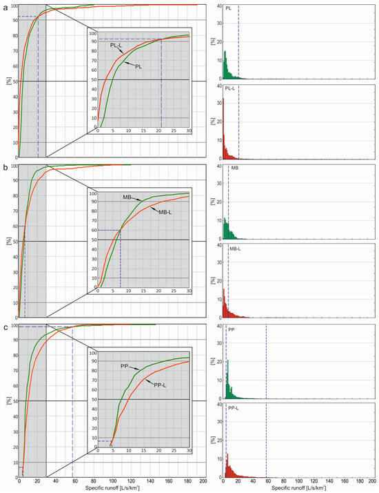 Cumulative frequencies (%) and histograms of specific runoff values in streams draining landslide (PL-L, MB-L, PP-L) and non-landslide (PL, MB, PP) catchments in the Pasmo Lubonia Range (a), the Mały Beskid Mts. (b), and the Pasmo Polic Range (c). The dashed lines indicate the specific runoff values at which the cumulative frequencies of specific runoff are the same in landslide and non-landslide catchments.