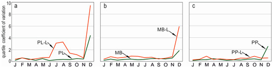 Monthly quartile coefficient of variation in specific runoff in streams draining landslide (PL-L, MB-L, PP-L) and non-landslide (PL, MB, PP) catchments in the Pasmo Lubonia Range (a), the Mały Beskid Mts. (b), and the Pasmo Polic Range (c).