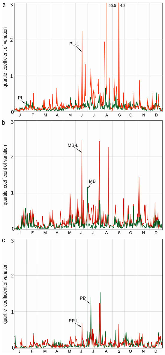 Daily quartile coefficient of variation in specific runoff in streams draining landslide (PL-L, MB-L, PP-L) and non-landslide (PL, MB, PP) catchments in the Pasmo Lubonia Range (a), the Mały Beskid Mts. (b), and the Pasmo Polic Range (c).