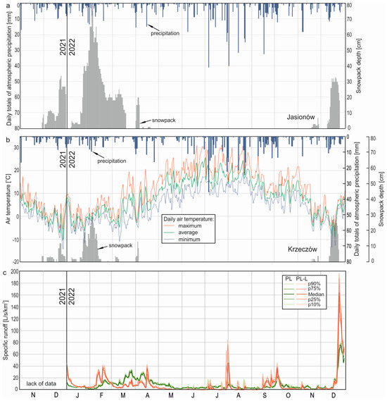 Meteorological conditions at Jasionów (a) and Krzeczów (b) meteorological stations two months before and when studied in 2022. Daily medians, quartiles, and deciles of specific runoff in streams draining landslide (PL-L) and non-landslide (PL) catchments in the Pasmo Lubonia Range (c).