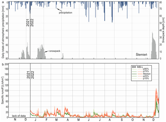 Meteorological conditions at Ślemień (a) meteorological station two months before and when studied in 2022. Daily medians, quartiles, and deciles of specific runoff in streams draining landslide (MB-L) and non-landslide (MB) catchments in the Mały Beskid Mts. (b).