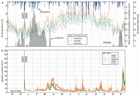 Meteorological conditions at Zawoja (a) meteorological station two months before and when studied in 2022. Daily medians, quartiles, and deciles of specific runoff in streams draining landslide (PP-L) and non-landslide (PP) catchments in the Pasmo Polic Range (b).